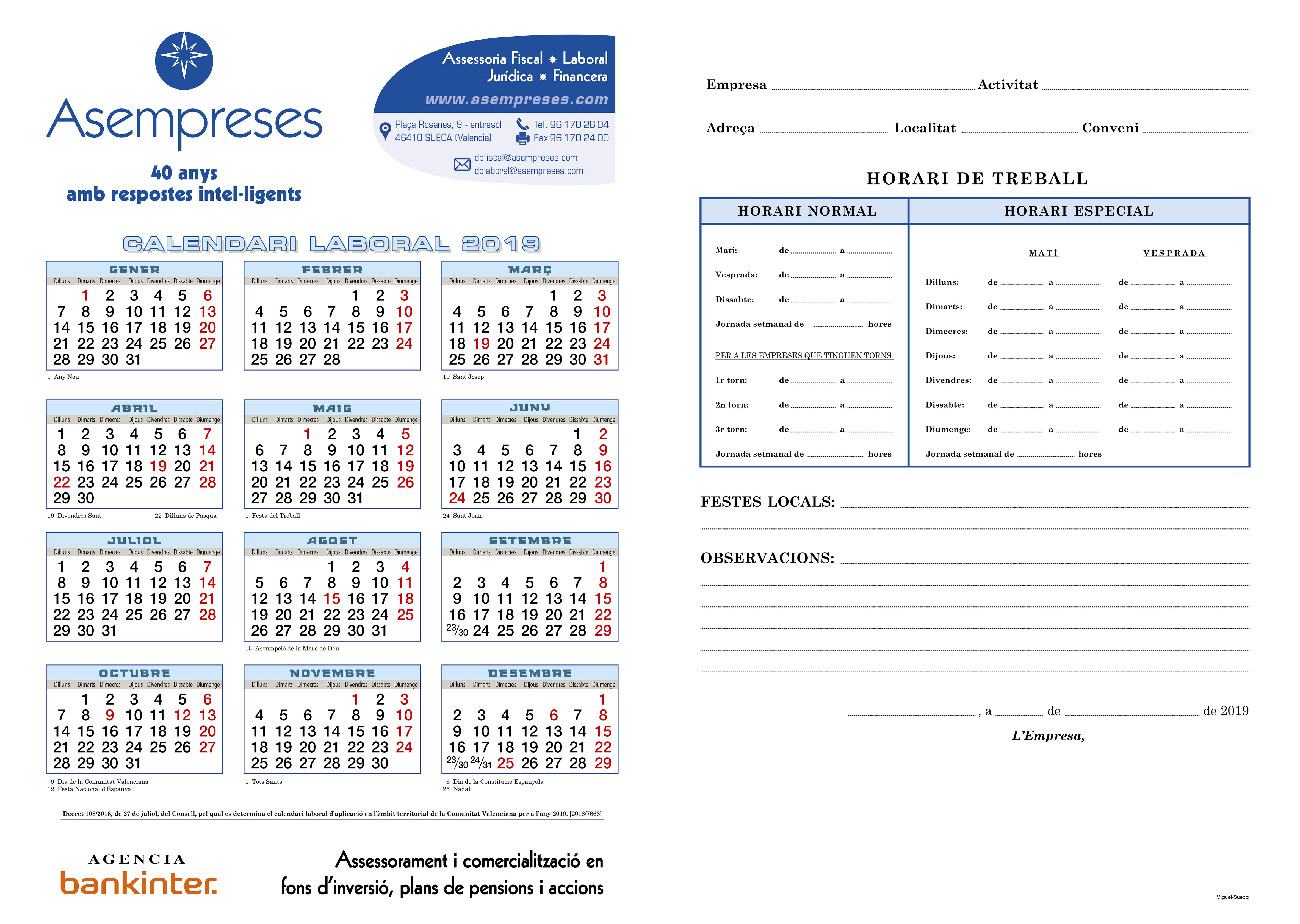 Nuevo calendario labora de 2019. Pulse en botón descargar para bajártelo.